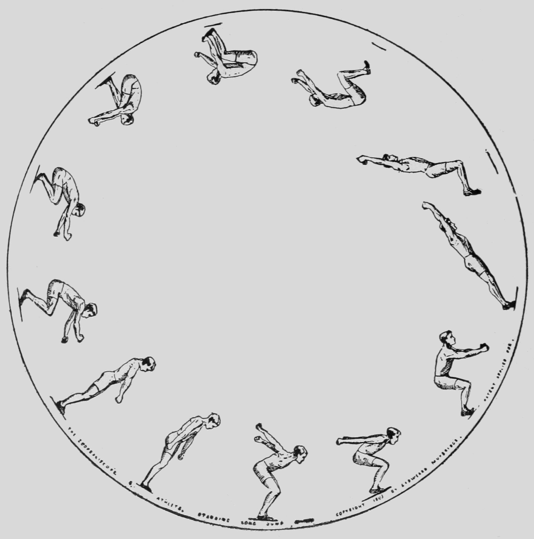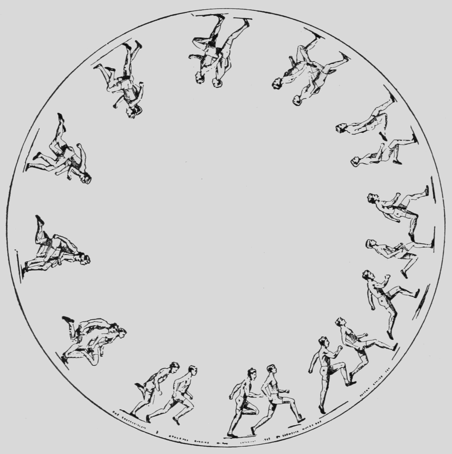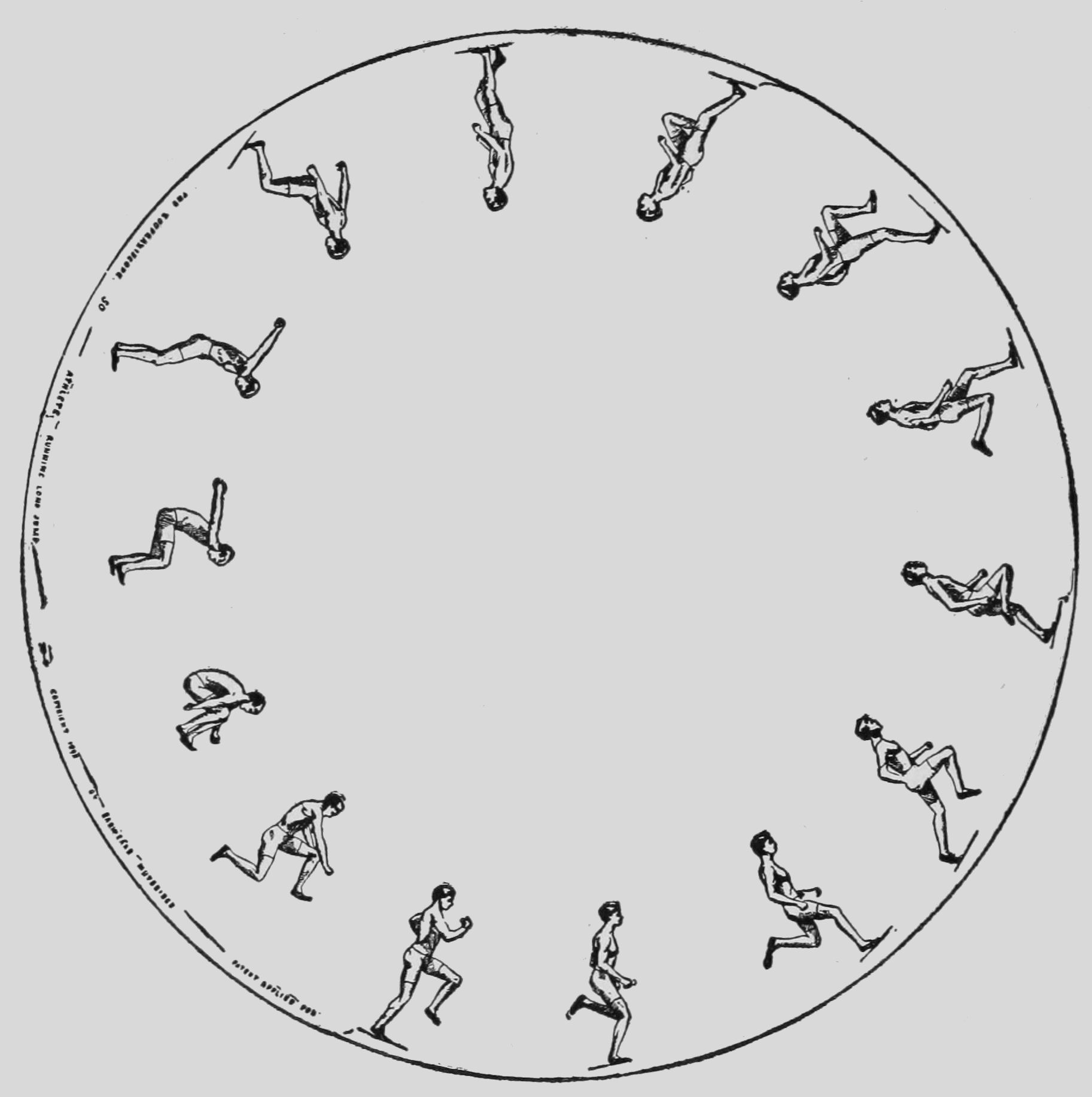 With this apparatus, horse-races are reproduced with such fidelity that the individual characteristics of the motion of every animal can readily be seen; flocks of birds fly across the screen with every movement of their wings clearly perceptible; two gladiators contend for victory with an energy which would cause the arena to resound with wild applause, athletes turn somersaults, and other actions by men, women and children, horses, dogs, cats and wild animals, such as running, dancing, jumping, trotting and kicking, are illustrated in the same manner. By this method of analysis and synthesis the eye is taught how to observe and to distinguish the differences between a true and a false impression of animal movements. The Zoöpraxiscopical exhibition is followed by illuminated copies of paintings and sculptures, demonstrating how the movement has been interpreted by the Artists of all ages; from the primitive engravers of the cave dwelling period, to the most eminent painters and sculptors of the present day.