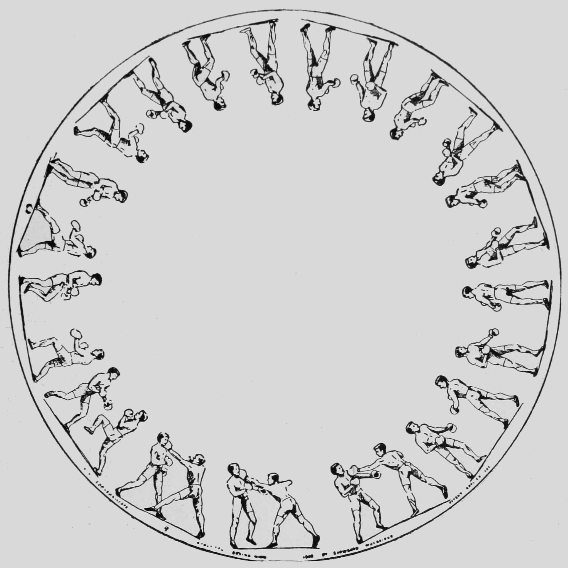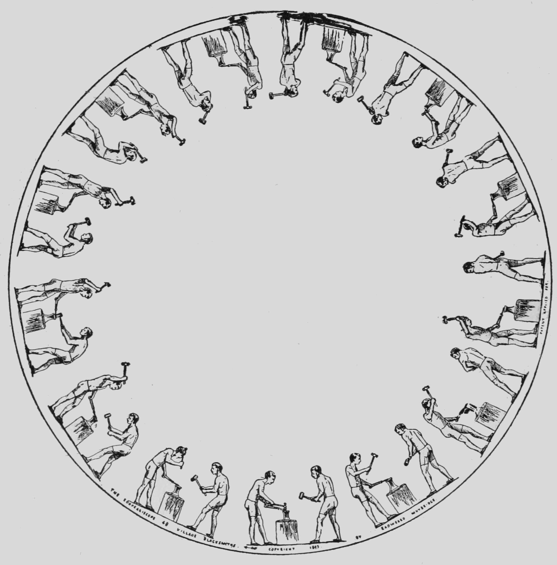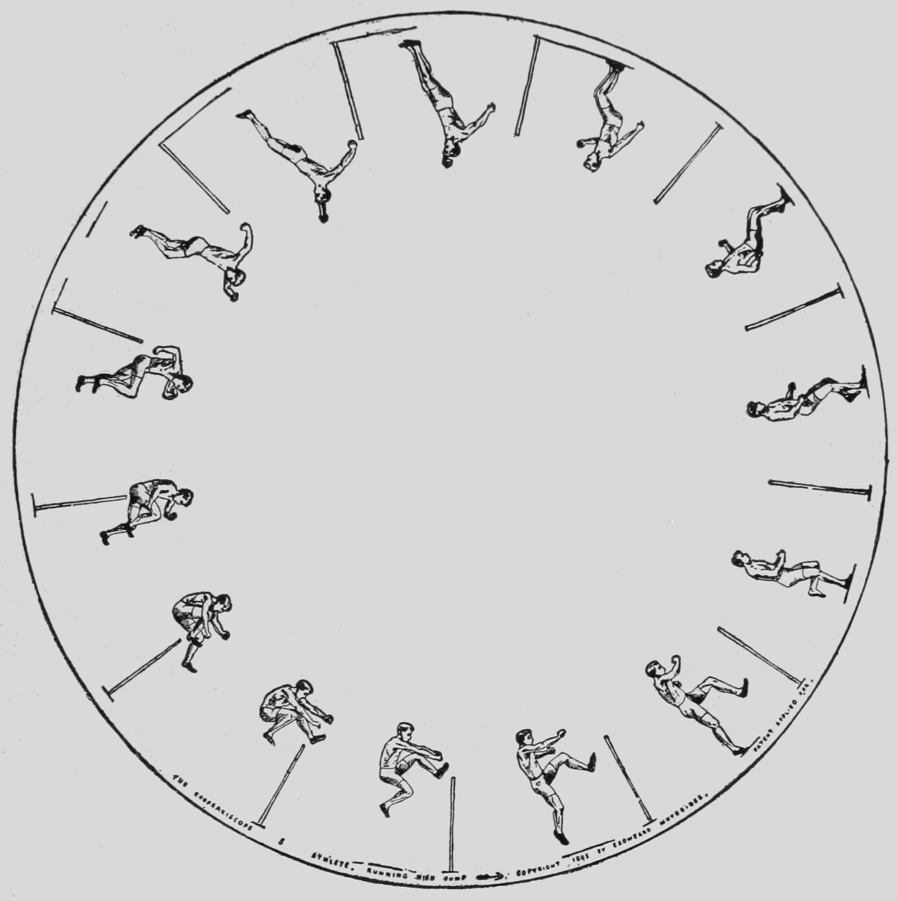 With this apparatus, horse-races are reproduced with such fidelity that the individual characteristics of the motion of every animal can readily be seen; flocks of birds fly across the screen with every movement of their wings clearly perceptible; two gladiators contend for victory with an energy which would cause the arena to resound with wild applause, athletes turn somersaults, and other actions by men, women and children, horses, dogs, cats and wild animals, such as running, dancing, jumping, trotting and kicking, are illustrated in the same manner. By this method of analysis and synthesis the eye is taught how to observe and to distinguish the differences between a true and a false impression of animal movements. The Zoöpraxiscopical exhibition is followed by illuminated copies of paintings and sculptures, demonstrating how the movement has been interpreted by the Artists of all ages; from the primitive engravers of the cave dwelling period, to the most eminent painters and sculptors of the present day.