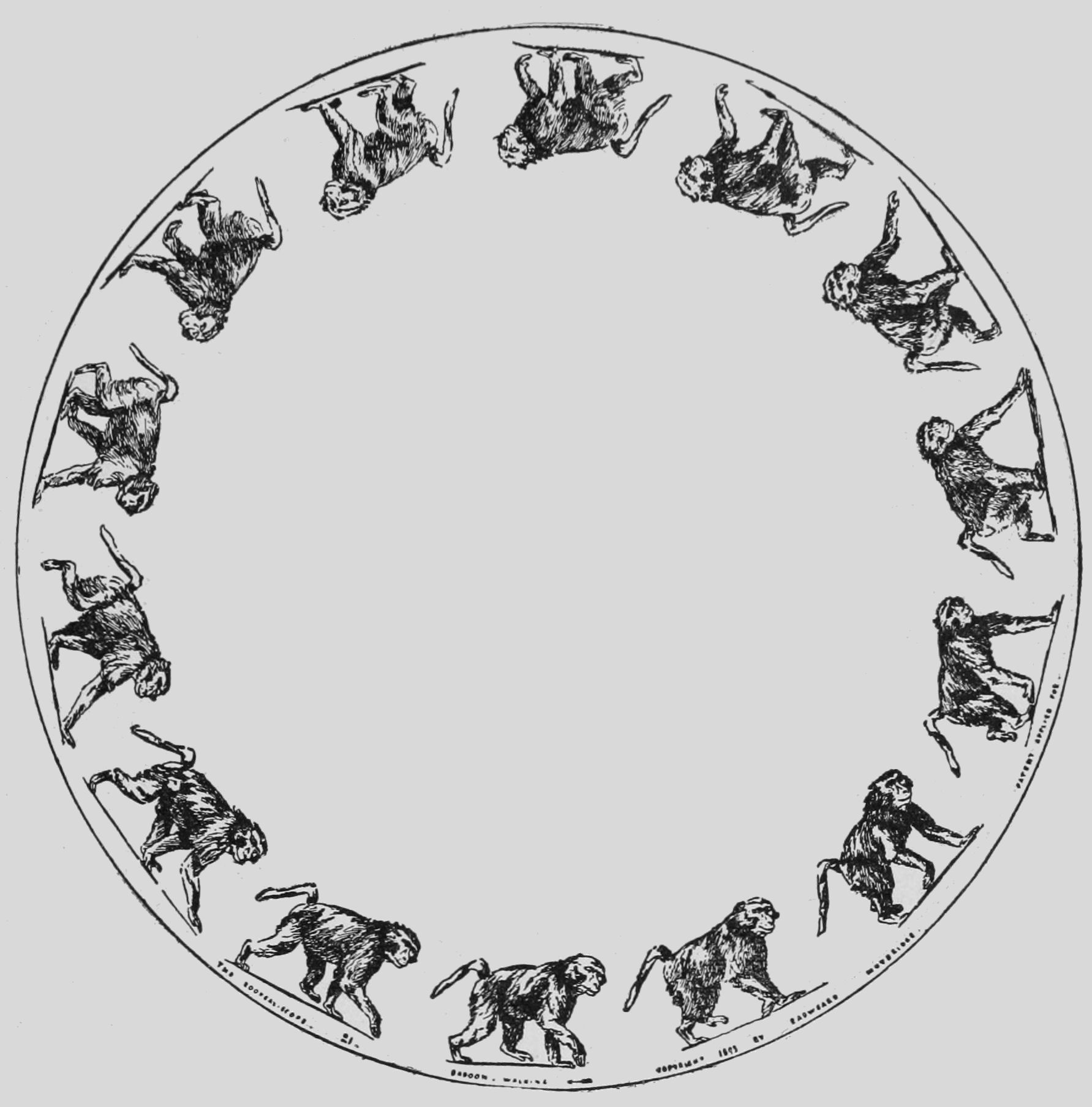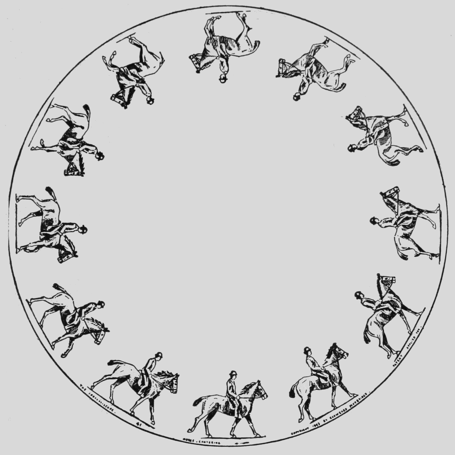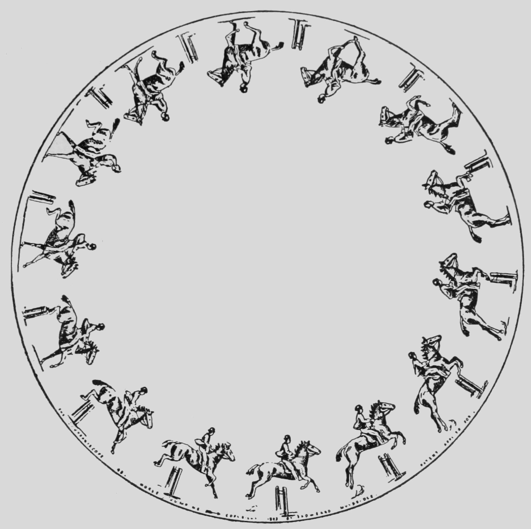 In the presentation of a Lecture on Zoöpraxography the course usually adopted is to project, much larger than the size of life upon a screen, a series of the most important phases of some act of animal motion—the stride of a horse, while galloping for example—which are analytically described. These successive phases are then combined in the Zoöpraxiscope, which is set in motion, and a reproduction of the original movements of life is distinctly visible to the audience.
