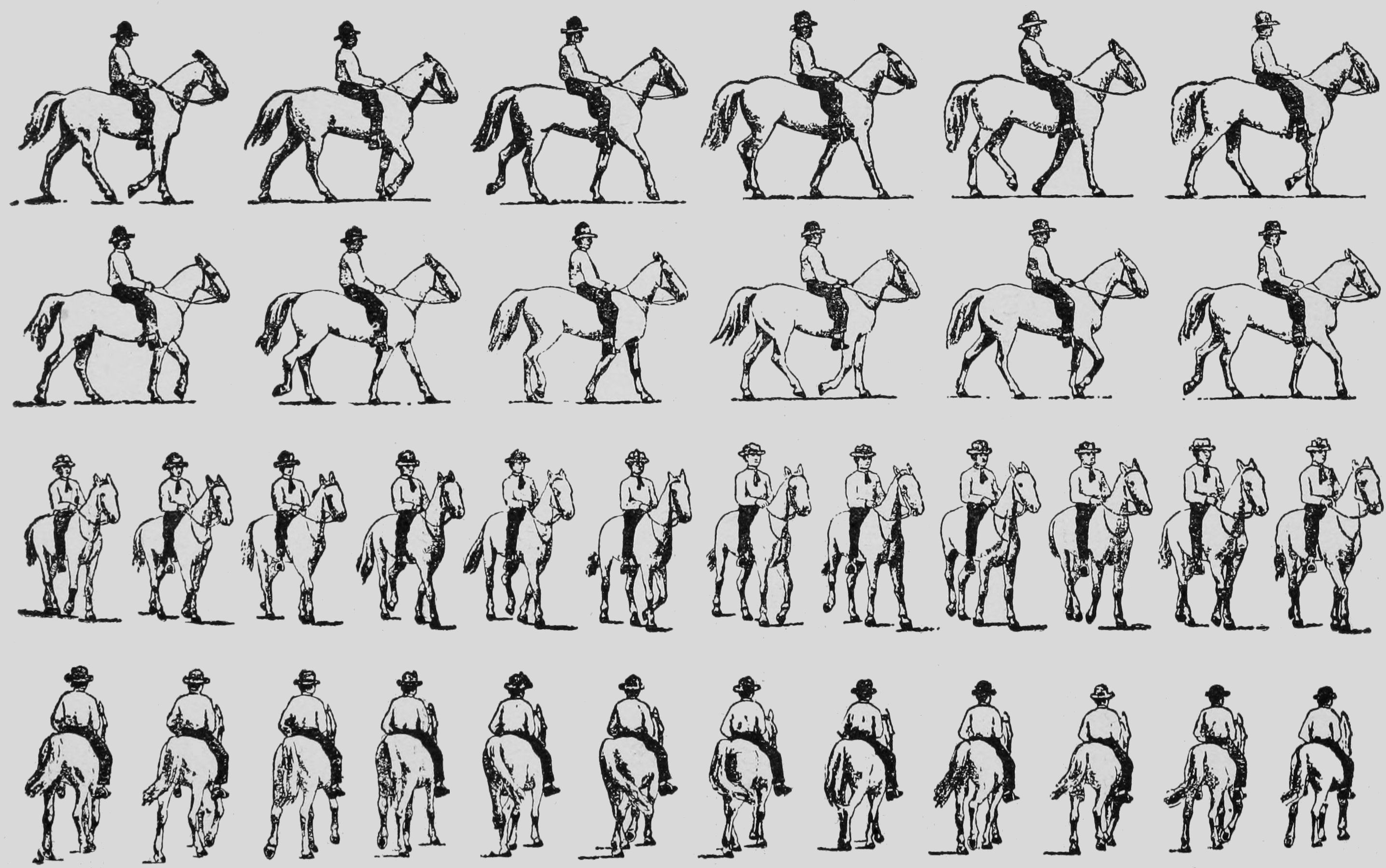 Several phases of as many different movements had been photographed, which the Author endeavored with little success to arrange in consecutive order for the construction of a complete stride.