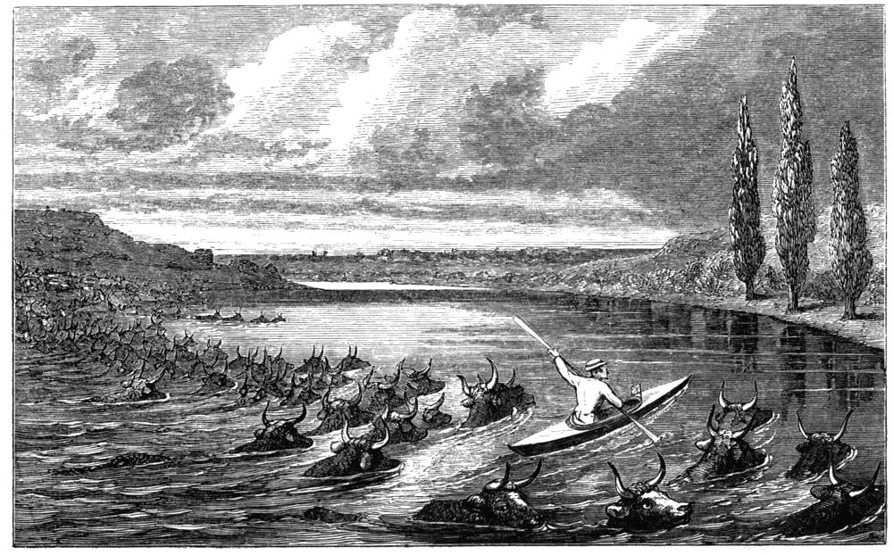 But these very things, which are obstacles or dangers to the "pair oar," become interesting features to the voyager in a covered canoe. For now, as he sits in his little bark, he looks forward, and not backward. He sees all his course, and the scenery besides. With one powerful sweep of his paddle he can instantly turn the canoe, when only a foot distant from fatal destruction. He can steer within an inch in a narrow place, or pass through reeds and weeds, branches and grass; can hoist and lower his sail without changing his seat; can shove with his paddle when aground, or jump out in good time to prevent a decided smash. He can wade and haul the light craft over shallows, or drag it on dry ground, through fields and hedges, over dykes, barriers, and walls; can carry it by hand up ladders and stairs, and can transport his boat over high[3] mountains and broad plains in a cart drawn by a horse, a bullock, or a cow.