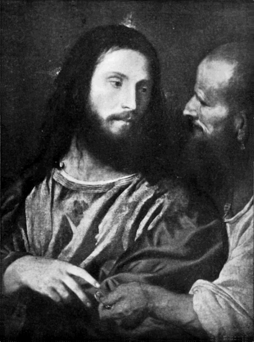 8. Christ of the Tribute Money. According to Vasari, painted for Duke Alfonso of Ferrara in 1514 for door of [xiv] a press. Assigned by Crowe and Cavalcaselle to the year 1518, the date accepted by Morelli. In the Dresden Gallery. Size: 2 ft. 5½ in. by 1 ft. 10 in.