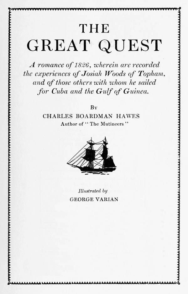 The Project Gutenberg EBook of The Great Quest, by Charles Boardman Hawes This eBook is for the use of anyone anywhere at no cost and with almost no restrictions whatsoever. You may copy it, give it away or re-use it under the terms of the Project Gutenberg License included with this eBook or online at www.gutenberg.org Title: The Great Quest Author: Charles Boardman Hawes Release Date: July 17, 2012 [EBook #40265] Language: English Character set encoding: ISO-8859-1 *** START OF THIS PROJECT GUTENBERG EBOOK THE GREAT QUEST *** Produced by Juliet Sutherland, Mary Akers, and the Online Distributed Proofreading Team at http://www.pgdp.net