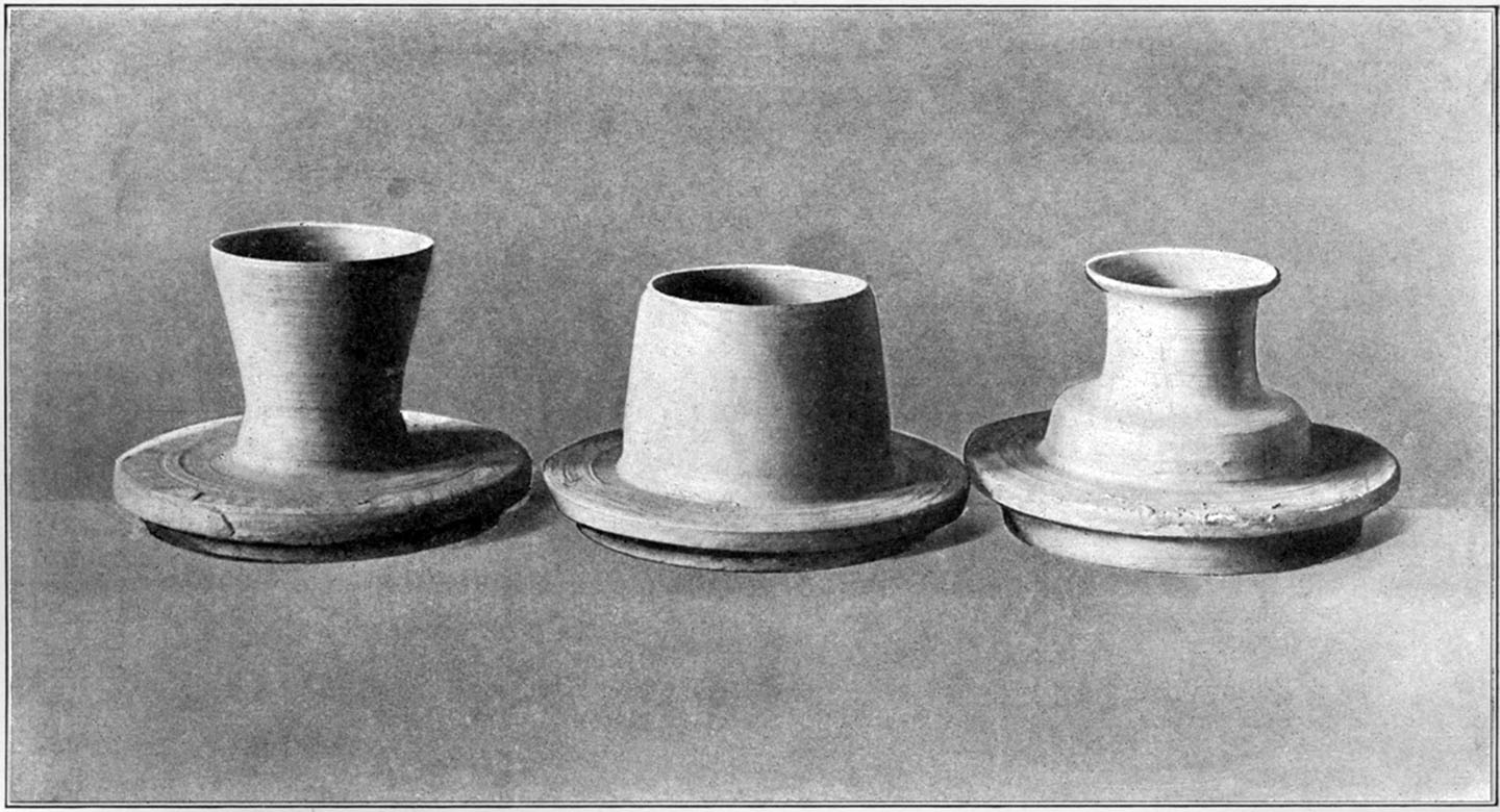 A favorite form with some designers is a bird's nest made into a flower holder. In this the same criticism applies. A bird's nest is always built to let water escape. Even a mud-lined nest is not impervious and the idea is obviously inappropriate. It is important that imitation be avoided and especially the imitation of material. One often hears the remark "How beautiful, it looks just like bronze." This, of course, comes from the casual observer to whom the skill of the imitation appeals but it cannot be too strongly insisted upon that to imitate one material in another is false from every point of view. Nor is it necessary. Clay is sufficient in itself. There are so many effects possible in pottery which are not possible in any other medium that it is entirely superfluous to seek outlandish texture and color. To be sure, such things are popular but that does not make them sound in principle or true in taste.