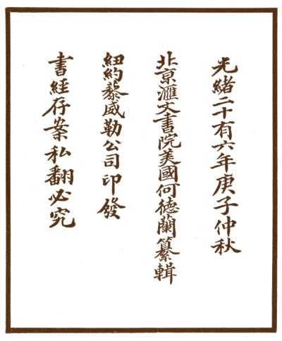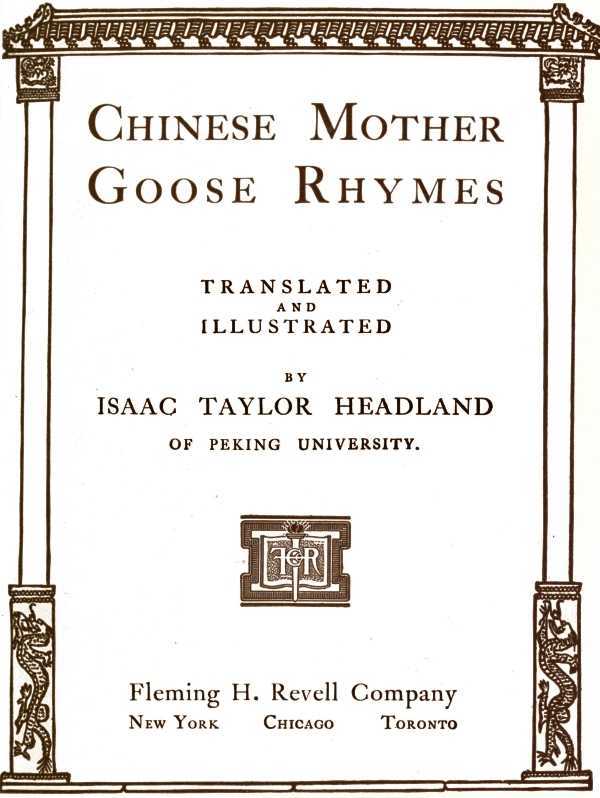 The compilation was much facilitated by the work done by Baron Vitali, of the Italian Legation in Peking; Rev. Arthur H. Smith, author of "Chinese Characteristics;" Miss Mabel Whiting, of Peking; Miss Mitchell, of Chinkiang; Mrs. McClure, of Honan; Miss Chalfant, of Shantung; Mr. Chao Tsz-chi, Chinese Consul at New York; Mr. Yamamoto, of Peking, and Rev. Chauncy Goodrich, of T'ung Chou, while the entire wor is due to the fact that our attention was called by Mrs. C. H. Fenn, of Peking, to her old nurse repeating these rhymes to her little boy.