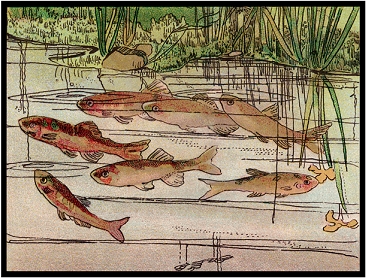 Sometimes as the children paddle up the stream they see a brown cloud in the water, darting up and up before them in swift swimming jerks. "Minnows!" they shout, and "Minnows, Ogre, look!" and watch the shoal of little fishes flashing through the water just out of reach of them. From moment to moment one of them turns half over in the water, with a flash of silver as he turns. And sometimes, when the Imp and the Elf are not paddling, and we are all three of us lying on the bank, we see the shoal swim slowly past us, and watch the minnows fling themselves right out of the water after the tiny flies that play over the surface of the stream. Then it is as if a clever juggler were hidden under the water and were throwing little curved knives up from the bottom of the stream to twist and sparkle in the air, and then fall plosh, plosh, into widening circles of ripples. Minnow after minnow leaps out of the water, turns and falls, and the ripples of the different splashes cross one another and cut the water into a thousand thousand glittering points of light.