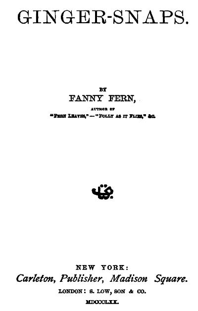 The Project Gutenberg EBook of Ginger-Snaps, by Fanny Fern This eBook is for the use of anyone anywhere at no cost and with almost no restrictions whatsoever. You may copy it, give it away or re-use it under the terms of the Project Gutenberg License included with this eBook or online at www.gutenberg.org/license Title: Ginger-Snaps Author: Fanny Fern Release Date: August 14, 2012 [EBook #40504] Language: English Character set encoding: ISO-8859-1 *** START OF THIS PROJECT GUTENBERG EBOOK GINGER-SNAPS *** Produced by sp1nd, Matthew Wheaton and the Online Distributed Proofreading Team at http://www.pgdp.net (This file was produced from images generously made available by The Internet Archive)