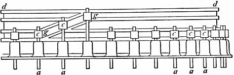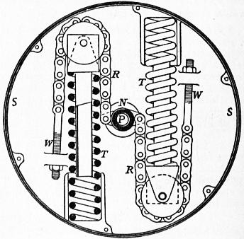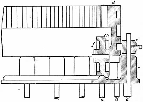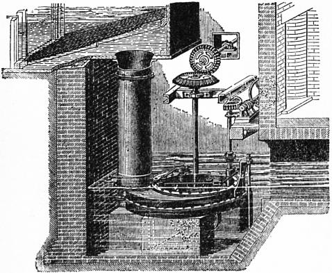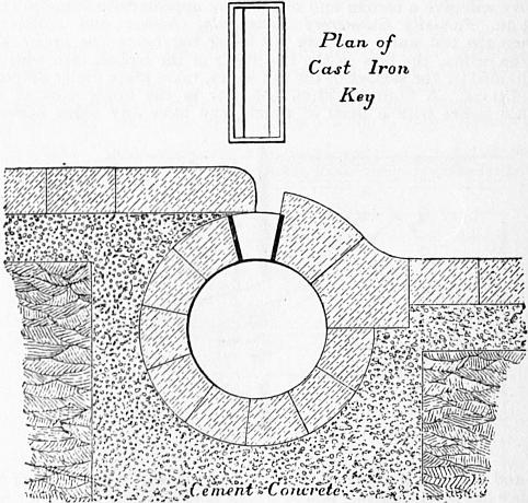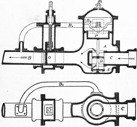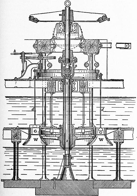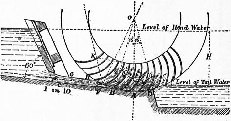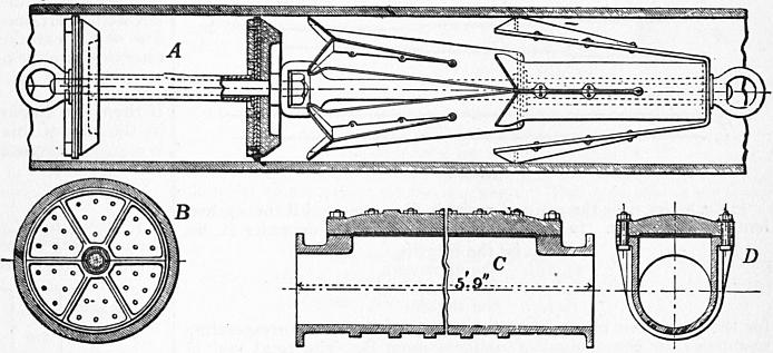 The quantity of water to be pumped by a centrifugal pump necessarily varies, and an adjustment for different quantities of water cannot easily be introduced. Hence it is that the average efficiency of pumps of this kind is in practice less than the efficiencies given above. The advantage of a vortex chamber is also generally neglected. The velocity in the supply and discharge pipes is also often made greater than is consistent with a high degree of efficiency. Velocities of 6 or 7 ft. per second in the discharge and suction pipes, when the lift is small, cause a very sensible waste of energy; 3 to 6 ft. would be much better. Centrifugal pumps of very large size have been constructed. Easton and Anderson made pumps for the North Sea canal in Holland to deliver each 670 tons of water per minute on a lift of 5 ft. The pump disks are 8 ft. diameter. J. and H. Gwynne constructed some pumps for draining the Ferrarese Marshes, which together deliver 2000 tons per minute. A pump made under Professor J. Thomson’s direction for drainage works in Barbados had a pump disk 16 ft. in diameter and a whirlpool chamber 32 ft. in diameter. The efficiency of centrifugal pumps when delivering less or more than the normal quantity of water is discussed in a paper in the Proc. Inst. Civ. Eng. vol. 53.