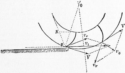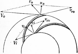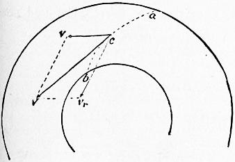 § 210. Case 2. Pump with a Whirlpool Chamber, as in fig. 210.—Professor James Thomson first suggested that the energy of the water after leaving the pump disk might be utilized, if a space were left in which a free vortex could be formed. In such a free vortex the velocity varies inversely as the radius. The gain of pressure in the vortex chamber is, putting ro, rw for the radii to the outlet surface of wheel and to outside of free vortex,