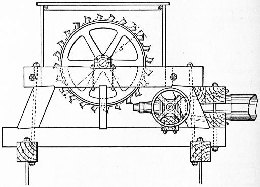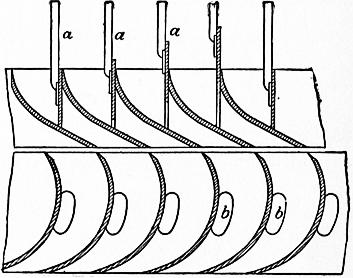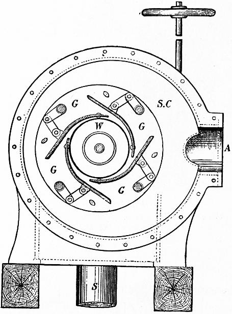 § 213. Centrifugal Fans.—Centrifugal fans are constructed similarly to centrifugal pumps, and are used for compressing air to pressures not exceeding 10 to 15 in. of water-column. With this small variation of pressure the variation of volume and density of the air may be neglected without sensible error. The conditions of pressure and discharge for fans are generally less accurately known than in the case of pumps, and the design of fans is generally somewhat crude. They seldom have whirlpool chambers, though a large expanding outlet is provided in the case of the important Guibal fans used in mine ventilation.