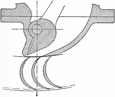 § 211. High Lift Centrifugal Pumps.—It has long been known that centrifugal pumps could be worked in series, each pump overcoming a part of the lift. This method has been perfected, and centrifugal pumps for very high lifts with great efficiency have been used by Sulzer and others. C. W. Darley (Proc. Inst. Civ. Eng., supplement to vol. 154, p. 156) has described some pumps of this new type driven by Parsons steam turbines for the water supply of Sydney, N.S.W. Each pump was designed to deliver 11⁄2 million gallons per twenty-four hours against a head of 240 ft. at 3300 revs. per minute. Three pumps in series give therefore a lift of 720 ft. The pump consists of a central double-sided impeller 12 in. diameter. The water entering at the bottom divides and enters the runner at each side through a bell-mouthed passage. The shaft is provided with ring and groove glands which on the suction side keep the air out and on the pressure side prevent leakage. Some water from the pressure side leaks through the glands, but beyond the first grooves it passes into a pocket and is returned to the suction side of the pump. For the glands on the suction side water is supplied from a low-pressure service. No packing is used in the glands. During the trials no water was seen at the glands. The following are the results of tests made at Newcastle:—
