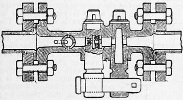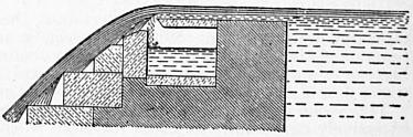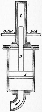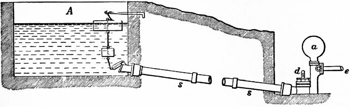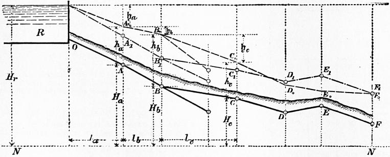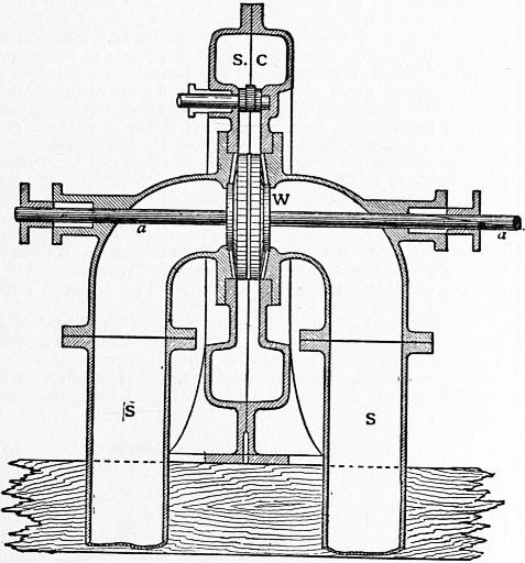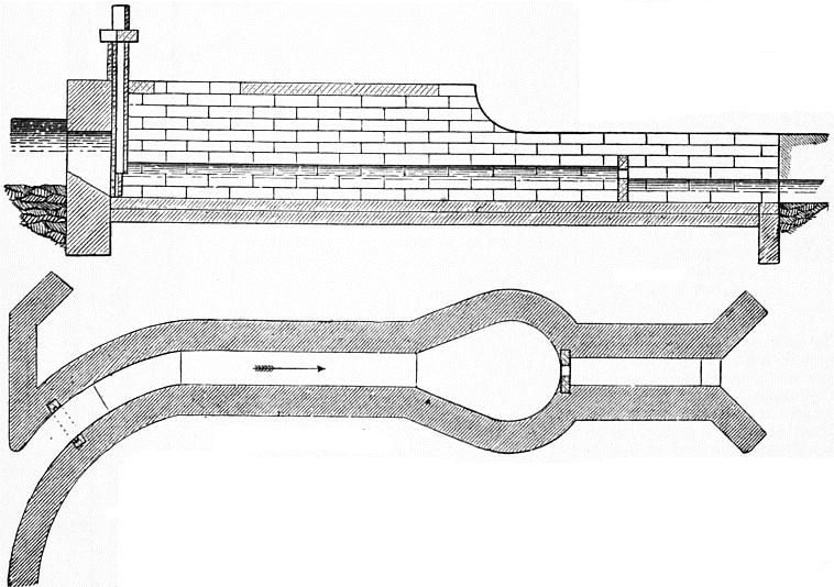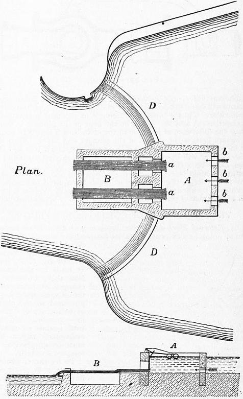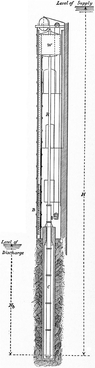 § 212. Air-Lift Pumps.—An interesting and simple method of pumping by compressed air, invented by Dr J. Pohlé of Arizona, is likely to be very useful in certain cases. Suppose a rising main placed in a deep bore hole in which there is a considerable depth of water. Air compressed to a sufficient pressure is conveyed by an air pipe and introduced at the lower end of the rising main. The air rising In the main diminishes the average density of the contents of the main, and their aggregate weight no longer balances the pressure at the lower end of the main due to its submersion. An upward flow is set up, and if the air supply is sufficient the water in the rising main is lifted to any required height. The higher the lift above the level in the bore hole the deeper must be the point at which air is injected. Fig. 212 shows an airlift pump constructed for W. H. Maxwell at the Tunbridge Wells waterworks. There is a two-stage steam air compressor, compressing air to from 90 to 100 ℔ per sq. in. The bore hole is 350 ft. deep, lined with steel pipes 15 in. diameter for 200 ft. and with perforated pipes 131⁄2 in. diameter for the lower 150 ft. The rest level of the water is 96 ft. from the ground-level, and the level when pumping 32,000 gallons per hour is 120 ft. from the ground-level. The rising main is 7 in. diameter, and is carried nearly to the bottom of the bore hole and to 20 ft. above the ground-level. The air pipe is 21⁄2 in. diameter. In a trial run 31,402 gallons per hour were raised 133 ft. above the level in the well. Trials of the efficiency of the system made at San Francisco with varying conditions will be found in a paper by E. A. Rix (Journ. Amer. Assoc. Eng. Soc. vol. 25, 110 1900). Maxwell found the best results when the ratio of immersion to lift was 3 to 1 at the start and 2.2 to 1 at the end of the trial. In these conditions the efficiency was 37% calculated on the indicated h.p. of the steam-engine, and 46% calculated on the indicated work of the compressor. 2.7 volumes of free air were used to 1 of water lifted. The system is suitable for temporary purposes, especially as the quantity of water raised is much greater than could be pumped by any other system in a bore hole of a given size. It is useful for clearing a boring of sand and may be advantageously used permanently when a boring is in sand or gravel which cannot be kept out of the bore hole. The initial cost is small.