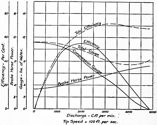 An extremely interesting experimental investigation of the action of centrifugal fans has been made by H. Heenan and W. Gilbert (Proc. Inst. Civ. Eng. vol. 123, p. 272). The fans delivered through an air trunk in which different resistances could be obtained by introducing diaphragms with circular apertures of different sizes. Suppose a fan run at constant speed with different resistances and the compression pressure, discharge and brake horse-power measured. The results plot in such a diagram as is shown in fig. 213. The less the resistance to discharge, that is the larger the opening in the air trunk, the greater the quantity of air discharged at the given speed of the fan. On the other hand the compression pressure diminishes. The curve marked total gauge is the compression pressure + the velocity head in the discharge pipe, both in inches of water. This curve falls, but not nearly so much as the compression curve, when the resistance in the air trunk is diminished. The brake horse-power increases as the resistance is diminished because the volume of discharge increases very much. The curve marked efficiency is the efficiency calculated on the work of compression only. It is zero for no discharge, and zero also when there is no resistance and all the energy given to the air is carried away as kinetic energy. There is a discharge for which this efficiency is a maximum; it is about half the discharge which there is when there is no resistance and the delivery pipe is full open. The conditions of speed and discharge corresponding to the greatest efficiency of compression are those ordinarily taken as the best normal conditions of working. The curve marked total efficiency gives the efficiency calculated on the work of compression and kinetic energy of discharge. Messrs Gilbert and Heenan found the efficiencies of ordinary fans calculated on the compression to be 40 to 60% when working at about normal conditions.