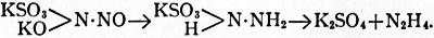 | C6H5N2Cl + K2SO3 = KCl + C6H5N2·SO3K, C6H5N2·SO3K + 2H = C6H5·NH·NH·SO3K, C6H5NH·NH·SO3K + HCl + H2O = C6H5·NH·NH2·HCl + KHSO4. |