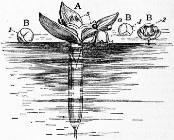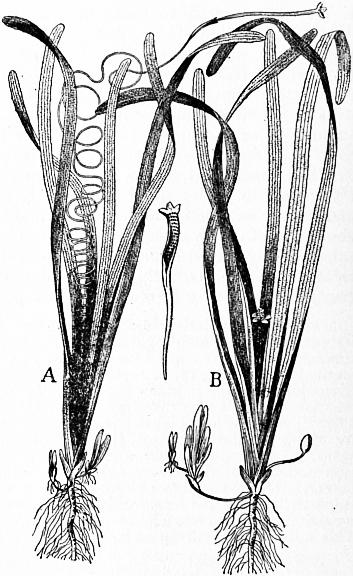 | Fig. 2.—Vallisneria spiralis—Eel grass—about 1⁄4 natural size. A, Female plant; B, Male plant. | Fig. 3. |