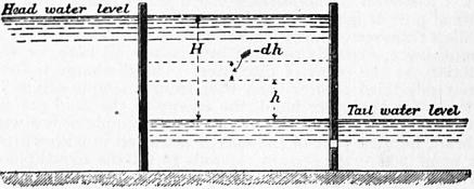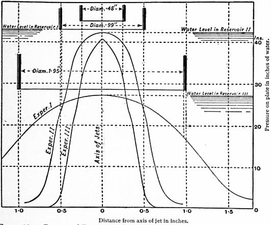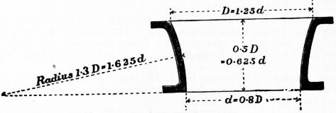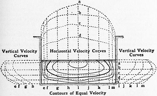 Roughly the pressure-head produced in a fan without means of utilizing the kinetic energy of discharge would be v2/2g ft. of air, or 0.00024 v2 in. of water, where v is the velocity of the tips of the fan blades in feet per second. If d is the diameter of the fan and t the width at the external circumference, then πdt is the discharge area of the fan disk. If Q is the discharge in cub. ft. per sec., u = Q/π dt is the radial velocity of discharge which is numerically equal to the discharge per square foot of outlet in cubic feet per second. As both the losses in the fan and the work done are roughly proportional to u2 in fans of the same type, and are also proportional to the gauge pressure p, then if the losses are to be a constant percentage of the work done u may be taken proportional to √p. In ordinary cases u = about 22 √p. The width t of the fan is generally from 0.35 to 0.45d. Hence if Q is given, the diameter of the fan should be:—
