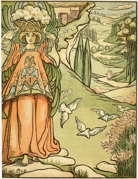 So Kit made her another bow and marched away again down the hill-side, whistling the same tune as before; and all the birds of the air came flying along when they heard it,[8] and they flew in front of him to show him the way, and he followed them over meadows and streams and orchards and cornfields, until they brought him to the walls of King Hurlyburly's city. And they would not have left him then, if he had not pointed out to them, most politely, that although it was very obliging of them to have come so far with him, he would find it a little inconvenient to travel any further with so many companions. So they flew away again; and Kit marched into the city and up to the gates of the King's palace.