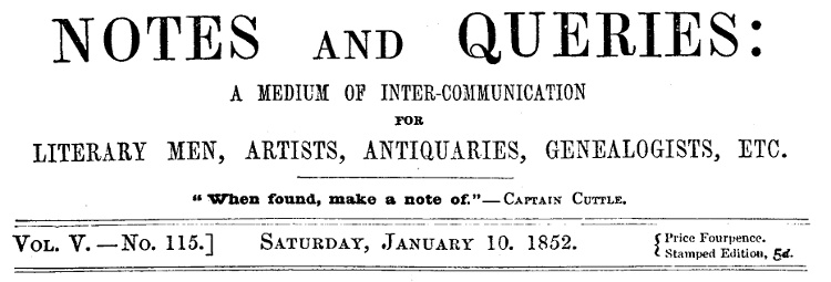 Replies to Minor Queries:—Proverbs—Infantry Firing—Joceline's Legacy—Winifreda; Stevens' "Rural Felicity"—"Posie of other Men's Flowers"—Abigail—Legend of St. Molaisse—Collars of SS.—Pronunciation of Coke—Use of Misereres—Inscription on a Pair of Spectacles—John Lord Frescheville—Nightingale and Thorn—Godfrey Higgins's Works—Ancient Egypt—Crosses and Crucifixes—Rotten Row—Borough-English—Tonge of Tonge—Queen Brunéhaut—"Essex Broad Oak"—Frozen Sounds and Sir John Mandeville, &c. 37
