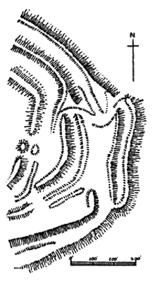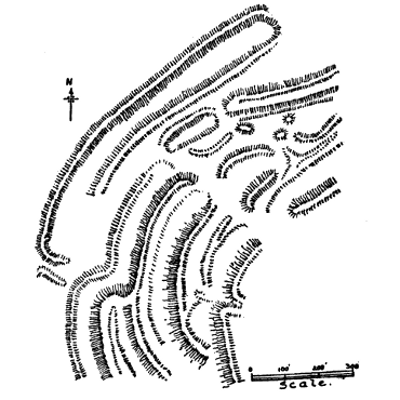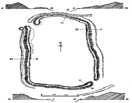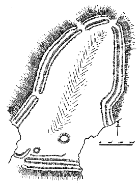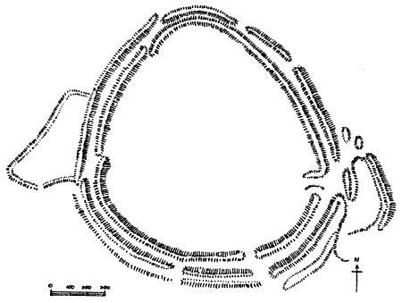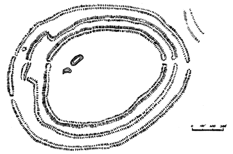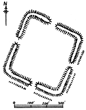 | This gigantic earthwork looms darkly in the distance, with indications upon its broken outline of the enormous mounds and fosses which render it one of the most impressive examples of its class. As a work of Neolithic man it commands attention, both by reason of the vastness of its plan and the skill shown in the design. | ||