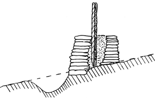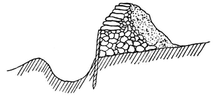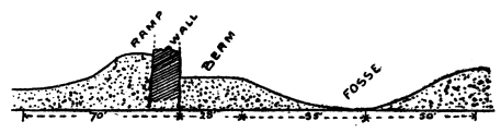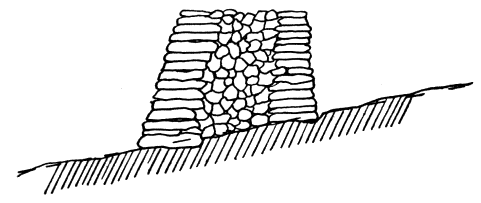Another fact is apparent when dealing with this subject: the earthwork is much more durable than any other form of castrametation, in fact it is almost indestructible so far as meteoric agencies are concerned, whereas the parapet suffers not only from disintegration by the weathering influences of rain, frost, wind, and heat, but also from the tendency to lose its original shape through having no natural or artificial coherence between the separate parts. Thus undoubted examples of prehistoric ramparts are comparatively rare when compared with the wealth of existent earthworks.