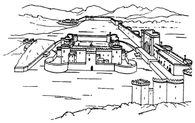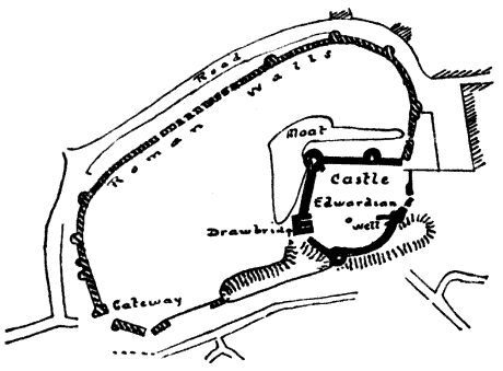 | Within the Roman walls encircling this ancient site a Concentric Castle was erected during the time of Edward I., a short portion of the existing wall being used for the new building. It was partly surrounded by a moat, a part of which appears in the view, while the drum tower occupying the centre is one of those designed to protect the approach to the Castle. | ||