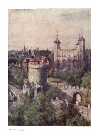 | The three lines of defence which render the Tower one of the most effective Concentric Castles in this country are well seen in the illustration. The outer encircling walls, the higher curtain wall of the second defence, with one of the many towers which bestride it, and the innermost of all, the White Tower, the finest example of a Norman Keep in England, may be distinctly located. | ||