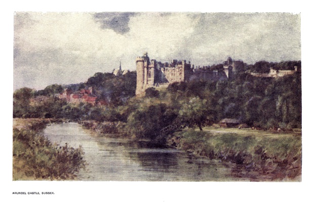 | This massive pile, overlooking the little river Arun at its base, stands upon a spur of chalk which once bore a Motte and Bailey Castle. The Motte is now crowned by a Shell Keep, seen towards the right of the picture, while some of the other buildings erected upon the enceinte form an effective group in the centre. | ||