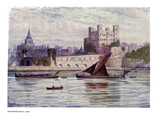 | Of Rochester Castle nothing of importance remains except the great Keep and fragments of walls. The Norman Keep was erected in the reign of Henry I. (1100-1135) and is one of the finest now in existence. It has seen many troublous times in its varied history, chiefly at the hands of King John and Simon de Montfort. The combination of Keep, Cathedral, and river presented in the view is particularly pleasing. | ||
