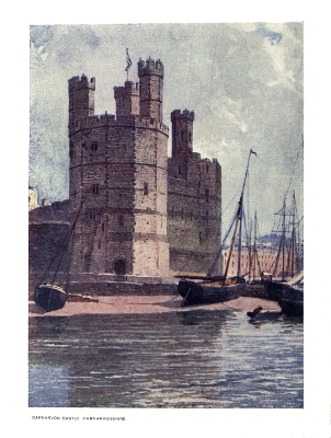 | One of the most impressive features of this great Castle, termed the finest in Europe, is the Eagle Tower with its many historical associations. The bands and dressings of dark sandstone are well shown in the illustration, while upon the merlons crowning the turrets may be perceived as little dots the statuettes of men and animals which usually occur upon the Edwardian Castles in Wales. | ||