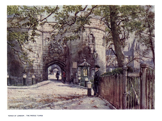 | This building might more aptly be termed 'The Barbican,' as it lies upon the farther side of the Moat from the Fortress. It now forms the entrance to the Tower from Tower Hill and affords access to the outer Bailey through the Byward Tower, whose entrance may be perceived through the archway. In earlier times this gate, which is one of those built by Henry III., was separated from a former outer barbican by the waters of the Moat, hence its name, the Middle Tower. | ||