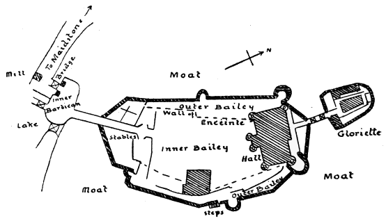 | This Castle is practically entire, having escaped the destructive hands of the Parliamentarians. It was raised in the early part of the reign of Edward III. and the Gatehouse forms an excellent example of castellation of that period. Strange to say, some of the original domestic apartments are still in a good state of preservation. | ||
