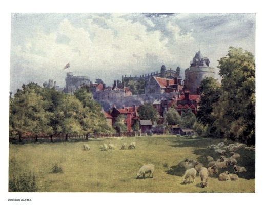 | Windsor Castle was originally of the Motte and Bailey type, but the Motte was subsequently crowned with a massive Shell Keep, one of the largest of its kind. It appears in the illustration surmounted by the Royal Standard. By later additions the Castle was rendered concentric. In the centre is the upper portion of St. George's Chapel, and on the right the Curfew Tower built by Henry III. and restored by Salvin, while in the front nestles a portion of the old town. | ||