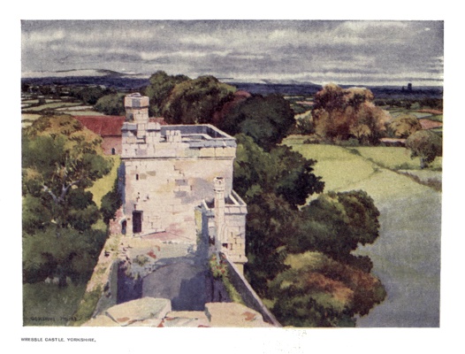 | Wressle Castle has a history which is indissolubly linked up with the great house of the Percies, who periodically maintained their court in it for centuries. Only the south façade is now standing, as the Parliamentarians destroyed the remaining three sides about 1650. It was surrounded by a moat and a deep dry ditch. The famous Household Book of Henry Percy, written soon after the country settled down after the Wars of the Roses, reveals elaborate details of the life in this Castle. The illustration shows how a castle built on level ground is able to look over a very extended area from its battlements. | ||