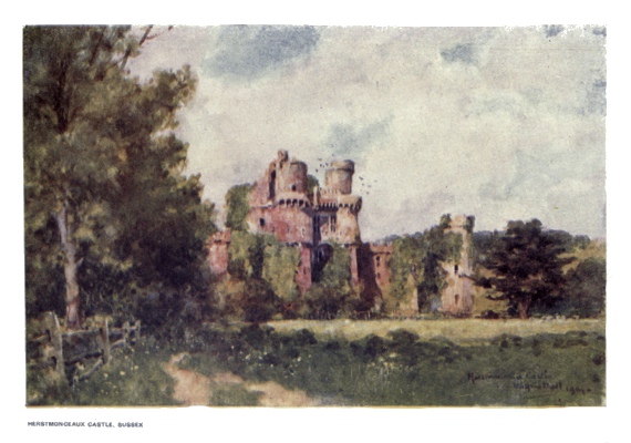 | One of the most picturesque ruins in Sussex and the most interesting of its class in the Kingdom. It was erected by a veteran of Agincourt and is based upon the plan of those existing in Gascony at that time. Only the encircling walls and towers now remain, the interior having been despoiled. The view shows the Gateway and a portion of the defences of the Causeway across the Moat. | ||