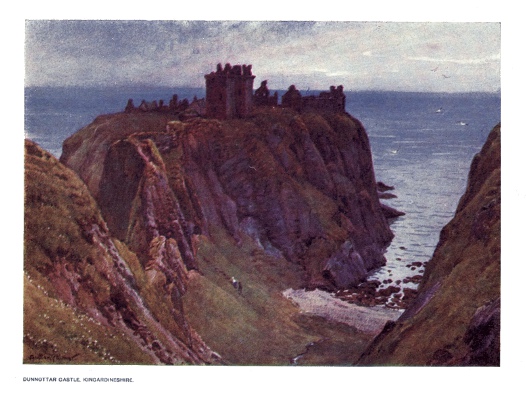| Dunnottar Castle is undoubtedly one of the most majestic ruins of the fourteenth century in Scotland, with a rich store of interesting history casting a halo of romance around the massive pile. The sea surrounds it on three sides, while a deep ravine upon the fourth severs it from the mainland. The tide of war has often ebbed and flowed before its hoary walls. The Keep was built by Sir William Keith in 1392, and in the Great Civil War the regalia of Scotland, which had been sent here for safety, was sent out of the Castle before its surrender to the English. | ||