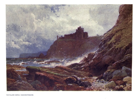 | Tantallon Castle stands upon a bold spur of rock south of the Firth of Forth. It is a magnificent example of a Quadrangular Castle, surrounded upon three sides by the waters of the North Sea, and defended upon the remaining side by gigantic walls flanked by the Keep, and also a deep ditch. | ||