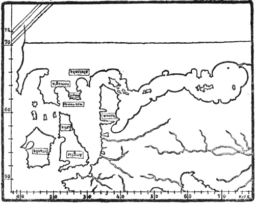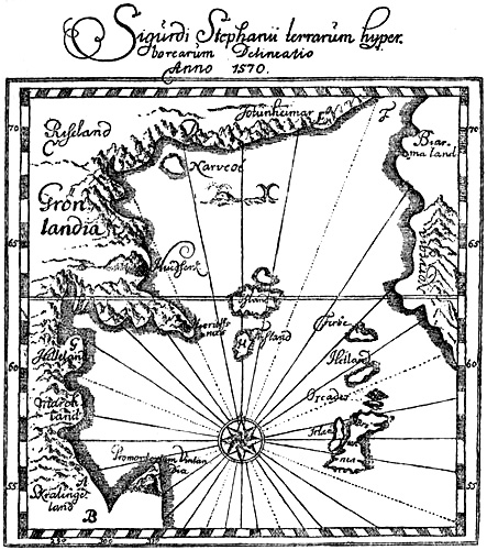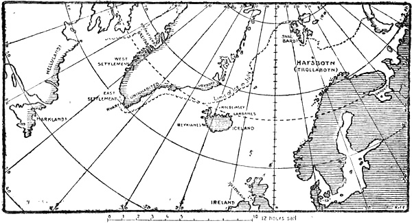 In the Flateyjarbók’s “Grönlendinga-þáttr” it is stated that Karlsevne, in Wineland, cut down timber to load his[Pg 26] ship, and that he had a “húsa-snotra” of “masur” from Wineland. Both accounts show how highly timber was prized in Greenland and Iceland. It is likely enough that this was so, since they had no timber in Greenland but driftwood, dwarf birch and osiers. But in order to find timber the Greenlanders need have gone no farther south than Markland (Newfoundland ?); and this name (perhaps also Helluland) may therefore have the surest historical foundation.