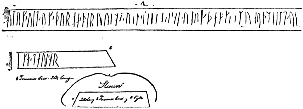 On the estate of Hönen, in Ringerike, there was found at the beginning of last century a runic stone, which was still from to be seen there in 1823, when the inscription was copied. Afterwards the stone disappeared.[20] The drawing made in 1823 is now only known from a somewhat indistinct copy; but from this Sophus Bugge [1902] has attempted to make out the runic inscription, and he reads it thus: