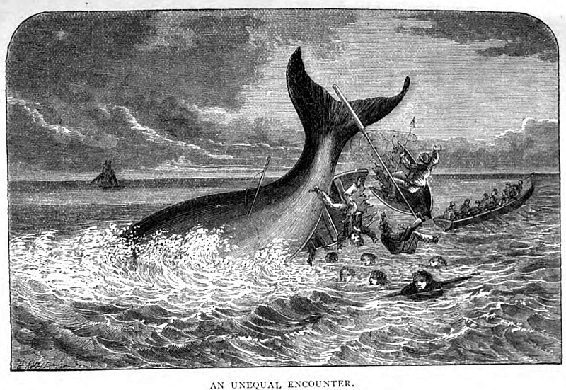 It was indeed time, for Sandy had observed by the movements of the whale that it was about to throw itself out of the water. Before we had pulled a couple of strokes it rose completely above the surface, and, rapidly turning, down came its enormous flukes on the very centre of our boat, cutting it in two, as if a giant’s hatchet had descended upon it. Those who were able sprang overboard and swam in all directions for our lives. Two poor fellows in the centre of the boat had been struck by those ponderous flukes, and, without uttering a cry, sank immediately. While Sandy, with a spear in his hand, still clung to the bows until jerked off by a second blow, which sent that part of the boat flying into the air.
