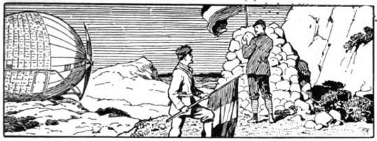 Nach diesen Worten verließen die beiden Reisenden wiederum das Raumschiff, und Doktor Müller begann mit dem Sextanten zu arbeiten. Es folgte eine kurze Rechnung. Dann markierte er einen Punkt der vor ihm liegenden Marskarte und trug die genauen Längen- und Breitengrade in das auf der Karte bereits befindliche Gradnetz ein. Weiter begann er in einer umfangreichen Tabelle zu blättern und bemerkte nach einem Blick auf die Uhr: „Wir haben noch sechs Stunden achtzehn Minuten und zehn Sekunden Zeit. Wenn wir dann mit voller Abarie abfahren, erreichen wir die Erdscheibe in guter glatter Fahrt. Jetzt wollen wir an den Merkstein gehen. Zunächst eine kleine Steinpyramide vor dieser glatten Felswand und auf diese Pyramide die Flaggen unserer beiden Länder. Weiter aber irgend eine allgemein verständliche Zeichnung auf diese glatte Felswand.“ Nach diesen Worten begannen die beiden Feldsteine zusammenzuschleppen, und im Laufe einer Stunde war eine zwei Meter hohe Pyramide errichtet, von deren Spitze lustig die Fahnen Deutschlands und Frankreichs im Winde flatterten. Danach ging Doktor Müller in das Raumschiff zurück, um in Kürze mit verschiedenen Ölfarbentöpfen und Pinseln wiederzukehren.