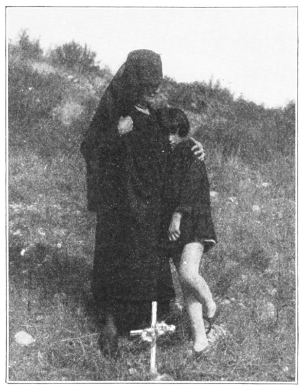 [Pg 178]Just then, a big motor car stopped not far away, and Jeanne watched a black-gowned lady and child step out. They carried flowers in their arms. They went to a little brown cross and they knelt.