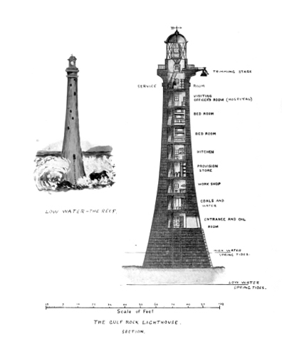 At this hour a two-knot current swept to the east around and over the treacherous reef whose sunken fangs were marked by the lighthouse. In calm weather, such as prevailed just then, it was difficult enough to effect a landing at the base of the rock, but this same smiling water-race became an awful, raging, tearing fury when the waves were lashed into a storm.