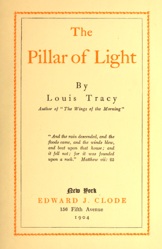 The Project Gutenberg EBook of The Pillar of Light, by Louis Tracy This eBook is for the use of anyone anywhere at no cost and with almost no restrictions whatsoever. You may copy it, give it away or re-use it under the terms of the Project Gutenberg License included with this eBook or online at www.gutenberg.org Title: The Pillar of Light Author: Louis Tracy Release Date: October 2, 2012 [EBook #40912] Language: English Character set encoding: ISO-8859-1 *** START OF THIS PROJECT GUTENBERG EBOOK THE PILLAR OF LIGHT *** Produced by D Alexander, Mary Meehan and the Online Distributed Proofreading Team at http://www.pgdp.net (This file was produced from images generously made available by The Internet Archive)