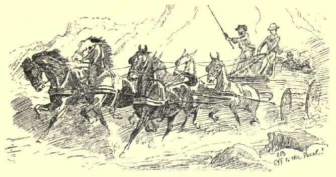 “Wild strange birds rose from the bracken as we passed, and flew strongly away over lake and mountain torrent, and the little black Kerry cows all watched us go by with ears pricked and heads inquiringly raised. The last stage of the journey had a brilliant finale. A herd of young horses was in our way in the narrow road, and the creatures careered before us, unable or too stupid to turn aside into the ditches by the roadside to let us through. We could not head them, and for fully a mile did those shaggy wild things caper and jump ahead, their manes flying out wildly with the glow from the west shining through them. Some imbecile cows soon joined them in the stampede, for no imaginable reason, unless they enjoyed the fright of being pursued, and the ungainly progress of those recruits was a sight to behold,—tails in the air and horns in the dust. The troop led the way right into the eye of the sunset. With this escort we entered Glenaragh.