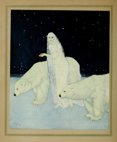 "I carry them home with me," continued the strange woman, "and I put them there where they are safe, and where they can await God's last call. I send my little dancing lights before me, and my ice bears walk with me everywhere. They come from great distances; the moment the moon shines bright they all assemble before my palace to let me know it is time for me to begin my search. They make my way, so that I should not go where the snow is too deep, or where the ice would wound my feet.