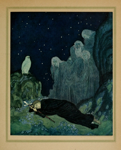He, too, for a while felt that he dared not leave the old woman who had led him to his love; so all that winter he wandered about with the travelling clan, from clime to clime, leaving far behind him the country of his dream. Wherever he went the falcon followed, flying as near his head as it could.