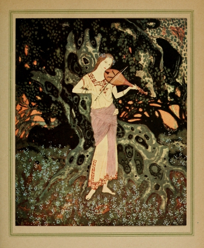 Down the dark narrow stairs he sped, out into the bright sunlight; there he paused a moment to pick up his stick and flute, then ran as if possessed; and before long he had left the sleepy red-roofed little town far behind.... Still he ran, ran, eager to get away from the eyes which were not the eyes he wanted.