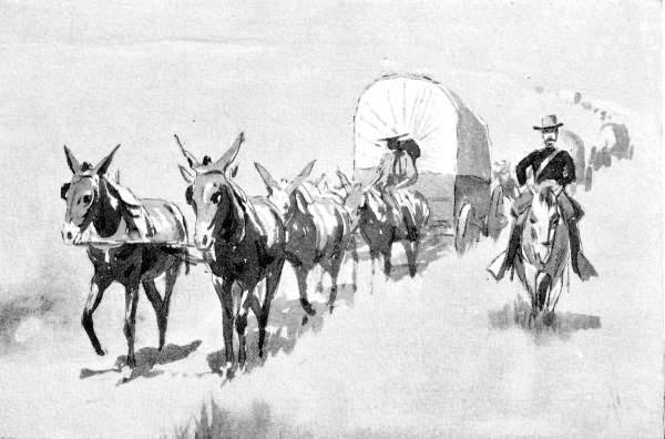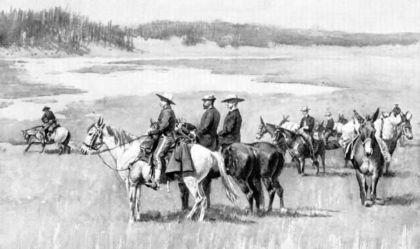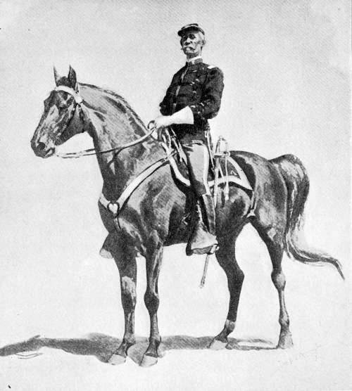 Before accepting an invitation to accompany an Indian commission into the Northwest I had asked the general quietly if this was a “horseback” or a “wagon outfit.” He had assured me that he was not a “wagon man,” and I indeed had heard before that he was not. There is always a distinction in the army between wagon men and men who go without wagons by transporting their supplies on pack animals. The wagon men have always acquired more reputation as travellers than Indian fighters. In a trip to the Pine Ridge Agency I had discovered that General Miles was not committed to any strained theory[2] of how mounted men should be moved. Any settled purpose he might have about his movements were all locked up in a desperate desire to “get thar.” Being a little late in leaving a point on the railroad, I rode along with Lieutenant Guilfoil, of the Ninth, and we moved at a gentle trot. Presently we met a citizen in a wagon, and he, upon observing the lieutenant in uniform, pulled up his team and excitedly inquired,