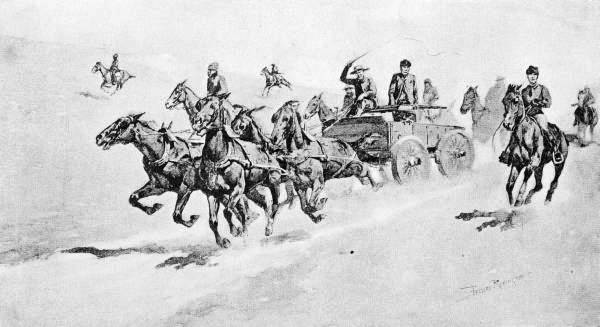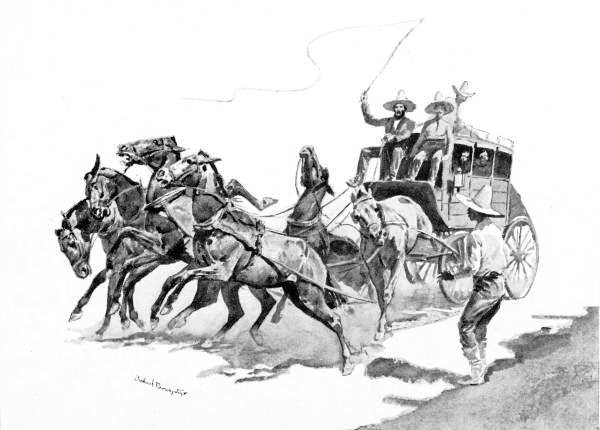 The eastern sky grows pale, and the irrepressible Dan begins to “honk” on his horn, and the cavalcade moves off through the grease-wood, which sticks up thickly from the ground like millions of Omaha war-bonnets.