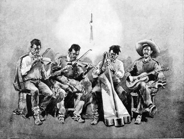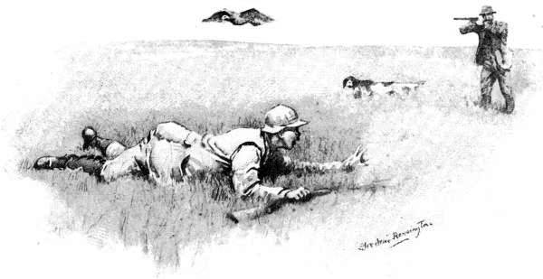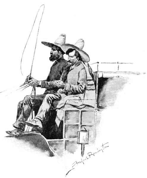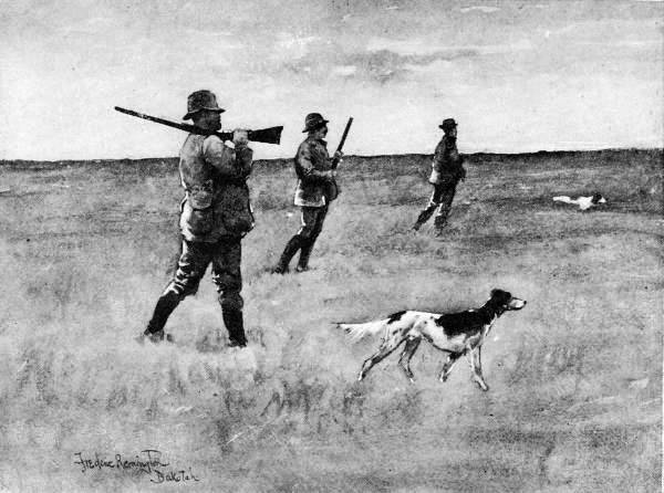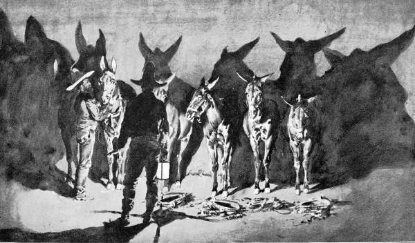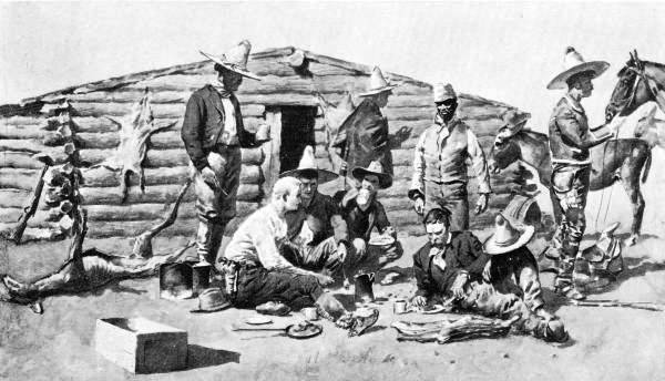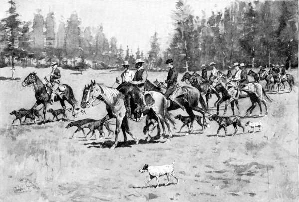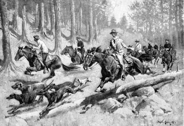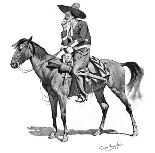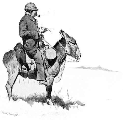 Dan, the foreman, was the huntsman. He was a shrewd-eyed, little, square-built man, always very much preoccupied with the matter in hand. He wore a sombrero modelled into much character by weather and time, a corduroy coat, and those enormous New-Mexican “chaps,” and he sounded a cow-horn for his dogs, and alternately yelped in a most amusing way. So odd was this yelp that it caught the soldiers, and around their camp-fire at night you could hear the mimicking shouts of “Oh, Rocks! eh-h-h! hooick! get down on him, Rocks; tohoot! tohoot!” We were sitting about on our horses in a little sienneca, while Dan was walking about, leading his pony and looking after his dogs.